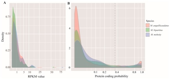 Orphan genes, with no recognizable homology to any sequences in other species, may contribute to the species-specific adaptations [15]. To identify orphan genes, a series of BLASTX searches were performed with the three species using an E value threshold of 1 × 10−5. The pairwise comparisons of D. rerio, C. carpio, O. niloticus proteomes and the three loach species CDS datasets resulted in a number of species-specific genes. In total, 2545, 1170 and 1005 species-specific genes were identified in M. anguillicaudatus, M. bipartitus and M. mohoity, respectively, after all-to-all BLASTX analyses. It is noteworthy that the average expression levels of these novel genes were low (Figure 2A). Because the assembly accuracy is affected by low read counts, we set a cutoff value of reads per kilobase of transcript per million mapped reads (RPKM > 1) to eliminate the assembly error. To exclude any of these genes that had orthologous in other species, we further checked them against the NR, Swiss-Prot and KEGG databases, after which 181, 163, and 104 orphan genes remained for M. anguillicaudatus, M. bipartitus and M. mohoity, respectively. The coding potential of these novel genes, the prediction of coding potential was performed with the Coding Potential Assessment Tool (CPAT, http://lilab.research.bcm.edu/cpat) [16]. According to the authors of CPAT, the optimum cut-off for protein coding probability was set at 0.364 to extract potential coding genes [17]. From the remaining 448 genes, 51 orphan genes (19 in M. anguillicaudatus, 18 in M. bipartitus, and 14 in M. mohoity) were identified in the genus Misgurnus (Figure 2B; Table S2). Because the uniqueness of these genes implies their species specificity, the biological functions of these proteins may encode key determinants of adaptation.