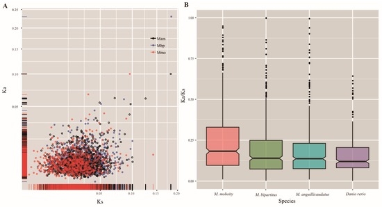 The Ka, Ks, and Ka/Ks ratios for terminal branches were estimated from each orthologous genes in three loaches. (A) Scatter plot of Ka and Ks in three loaches based on the free-ratio model; (B) The distribution of Ka/Ks ratios for terminal branches. D. rerio was selected as a representative. Mam, Mbp, and Mmo in (A) indicate M. anguillicaudatus, M. bipartitus and M. mohoity, respectively.