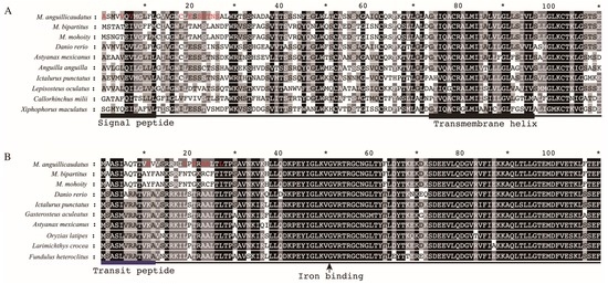 The positively selected sites were identified using LRTs with FDR correction (p < 0.05) and Bayes Empirical Bayes estimates (BEB > 0.95). Twenty, 20, and nine PSGs with sites under positive selection were detected in the M. anguillicaudatus, M. bipartitus, and M. mohoity lineage, respectively (Table S7). The numbers of positively selected sites in the M. anguillicaudatus (44 sites) and M. bipartitus (32 sites) lineages were higher than that in the M. mohoity (13 sites) lineage. Among these positively selective sites, 10 sites in cldn15lb and six sites in isca1, which are involved in paracellular Na+ transport and Fe/S cluster assembly, were detected in the M. anguillicaudatus lineage, implying the biological importance of these two genes in adaptations of M. anguillicaudatus. Given that no suite temples were available for the homology modeling of Cldn15lb and Isca1 in the public protein databases, the functional significance of the positively selected sites was further investigated by locating them within the secondary structures of Cldn15lb and Isca1, which were predicted with homology searching, SignalP [26], and TMHMM [27]. In Cldn15lb, four positively selected sites (1A, 5V, 7V, 18C) occurred in the signal peptide (Figure 4A), whereas another six sites occurred in chain segments. Similarly, protein structure prediction showed that three positively selected sites of isca1 occurred in the transit peptide (Figure 4B) and the remained sites were located in the chain segments.