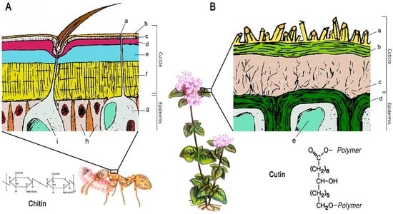 Curiously, and despite being phylogenetically unrelated, plants and arthropods share a very similar external tegument, which, in both cases, is called “cuticle” and is made of a stratified deposits of organic compounds on the epidermal cells (Figure 1). The challenging need to maintain the water balance in aerial habitats could explain this remarkable case of parallel evolution [1]. In both taxa, the primary function of the cuticle is the prevention of water loss, a feature that is mainly determined by the physical arrangement of surface lipids [6,7,9,10]. More in general, terrestrial organisms have to cope with a “changing” environment, where temperatures, humidity and sun radiations are not constant. Thanks to the cuticle, acting as a plastic barrier able to respond to outer variations by modulating its characteristics (not exclusively its waterproofing), some plants and arthropods survive also in extreme conditions [7,9,11].