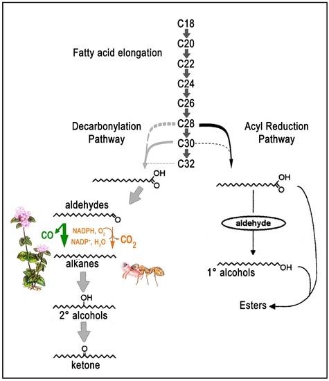 Biosynthetic pathway of cuticle compounds, modified from [69]. Decarbonylation (grey arrows) and acyl reduction (black arrows) pathways are shown. Dotted arrows indicate potential, minor steps. Plant and insect (adapted from [67]) decarbonylation are marked in green and brown, respectively. See the main text for further explanation.