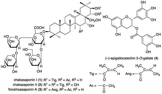 Structures of chakasaponins I (1) and II (2), floratheasaponin A (3), and (–)-epigallocatechin 3-O-gallate (4).