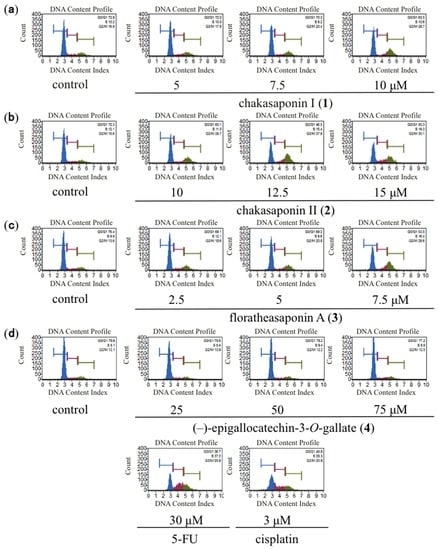 Apoptosis and cell cycle dysfunction are closely associated biochemical processes, and any disturbance in cell cycle progression may lead to apoptotic cell death [19]. The effects of cell cycle distribution were analyzed to determine the mechanism associated with the growth inhibitory effect of chakasaponins I (1) and II (2), floratheasaponin A (3), and (–)-epigallocatechin 3-O-gallate (4) on HSC-2 cells [20,21]. The cell distribution in G0/G1, S, and G2/M phases shown in blue, red, and green areas, respectively, were determined after a 48 h incubation (Figure 2). As shown in Table 2, compounds 1–3 significantly induce populations of the cell distribution in S and G2/M phases, but reduce that of the G0/G1 phase. However, compound 4 does not affect the cell cycle distribution at the effective concentration. These results imply that compounds 1–3 induced the cell cycle arrest at the G2/M phase.