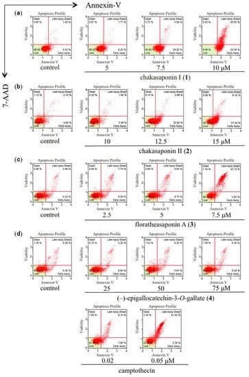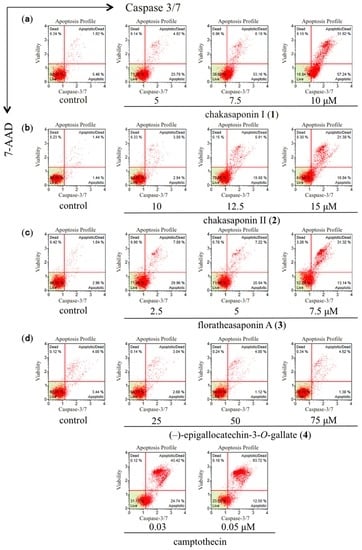 Caspase play a central role in the apoptotic signaling. During apoptosis, caspase activity contributes to the degradation of DNA and leads to further disruption of cellular components, resulting in alterations of cell morphology [22,27,28,29]. To confirm that caspases are involved the enzyme activity of caspase-3/7 in HSC-2 cells after coculture with compounds 1–4, the activities of caspase-3/7 were measured by Muse® Cell Analyzer (Figure 6). As shown in Table 4, the activation of caspase-3/7 by compounds 1–3 was found to occur in a concentration-dependent manner. These results suggest that the antiproliferative effects of acylated saponin constituents isolated from “tea flower” (1–3) against HSC-2 involve apoptotic cell death via activation of caspase-3/7. The efficacies of these saponins were found to be stronger than that of compound 4, the most abundant polyphenol constituent in “green tea”.