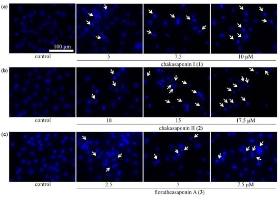 Representative morphological features of apoptosis in HSC-2 cells were examined under an inverted light fluorescence microscope using 4′,6-diamidino-2-phenylindole dihydrochloride (DAPI) as a staining agent [24]. As shown in Figure 4, the cell shrinkage caused by compounds 1–3 was mediated partially through apoptosis induction as nuclear chromatin condensation. Nuclei of the cells treated with compound 4 showed the obvious changes only slightly, while evident nuclear condensation was observed in cells treated with compounds 1–3.
