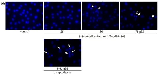 Morphological analysis of HSC-2 cells treated with 1–4 and camptothecin. Morphology of representative fields of HSC-2 cells stained with 4′,6-diamidino-2-phenylindole dihydrochloride (DAPI) after treatment with (a) 5, 7.5, and 10 µM of 1; (b) 10, 15, and 17.5 µM of 2; (c) 2.5, 5, and 7.5 µM of 3; (d) 25, 50, and 75 µM of 4 and 0.05 µM of camptothecin for 48 h; the cells indicated by arrows represent fragmented and condensed nuclear chromatins; commercial camptothecin was purchased from Wako Pure Chemical Industries, Ltd. (Osaka, Japan).