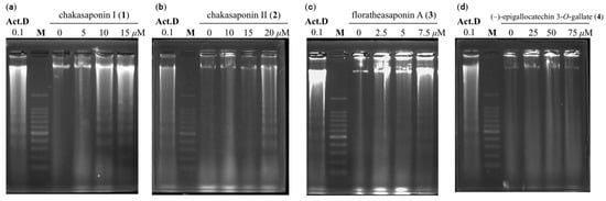 DNA fragmentation in HSC-2 cells treated with 1–4 and actinomycin D. Representative DNA fragmentation of HSC-2 treated with (a) 5, 10, and 15 µM of 1; (b) 10, 15, and 20 µM of 2; (c) 2.5, 5, and 7.5 µM of 3; (d) 25, 50, and 75 µM of 4, and (Act.D) 0.1 µM of actinomycin D for 48 h; (M) represents a marker (100 bp DNA ladder); commercial actinomycin D was purchased from Wako Pure Chemical Industries, Ltd. (Osaka, Japan).