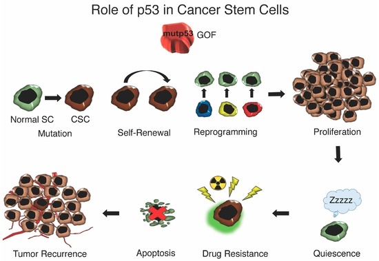 Since CSCs behave similarly to non-malignant stem cells, it is not surprising that mutp53 plays a role in this population as wtp53 is important to non-malignant stem cells. CSCs are less susceptible to chemotherapy compared to the vast majority of the tumors due to a slow proliferation rate, efficient DNA repair, high expression of anti-apoptotic proteins and ABC multi-drug pumps [110,111,112,113]. Interestingly, p53 splice variant isoform ∆133p53β promotes CSC potential in MCF-7 breast cancer cells, stimulating the expression of key pluripotency factors SOX2, OCT3/4 and Nanog [24,114].