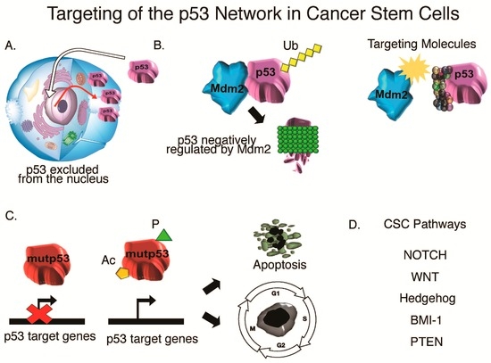 Targeting of the p53 Network in cancer stem cells. (A) Restoring p53 transcriptional activity be preventing/restoring p53 exclusion from the nucleus; (B) targeting molecules to disrupt the p53-Mdm2 interaction to prevent p53 degradation; (C) restoring mutant p53 function by modifications; (D) targeting CSC pathways.