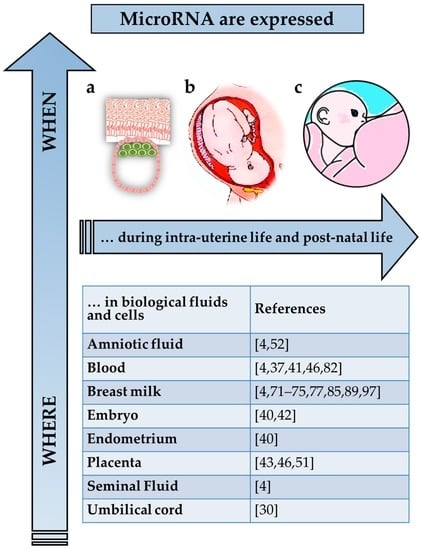 The biological dialogue between a mother and her offspring starts from the implantation of the embryo in the uterus and continues during fetal life via the maternal–placental–fetal axis []. In this review, we summarize the current knowledge concerning the role(s) of miRNA in the regulation of various physiological and pathological processes involved in maternal-infant crosstalk during both pregnancy and suckling periods. The expression of miRNAs is ubiquitous; they are present in cells and body fluids of both maternal and fetal origin. Here we focus on their potential participation in offspring development throughout prenatal and post-natal life. In particular, we discuss and cite studies congruent with the functional hypothesis [], which proposes that milk miRNAs are absorbed by the GI of the suckling baby to ensure and regulate specific physiological processes.