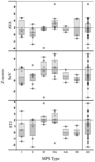 Z-scores of aortic root measurements for subtypes of mucopolysaccharidosis patients in a Tukey boxplot. The open circles represent the z-score of each individual patient at the AVA (aortic valve annulus), SoV (sinuses of Valsalva), and STJ (sinotubular junction). The 25–75th percent interquartile range is represented by the edges of the box. The circular points above the dotted line indicate aortic root measurements that exceed the 97th percentile of normal measurements.