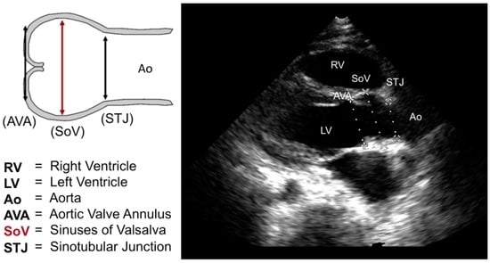 We conducted an anonymized, retrospective chart review of 34 patients with enzymatically or molecularly confirmed mucopolysaccharidoses evaluated at Children’s Hospital of Orange County (CHOC). The study (IRB #1409104) was approved by the CHOC institutional review board (8 October 2014). As the study was retrospective and anonymized, the IRB approved our request for waiver of informed consent. The MPS type, treatment status, age, gender, height, and weight were extracted from the most recent cardiology clinic outpatient visit note during which an echocardiogram was performed. The body surface area (BSA) in square meters was calculated using the Haycock method []. The most recent echocardiogram for each patient was reviewed and measurements from the proximal aorta at the aortic valve annulus (AVA), sinuses of Valsalva (SoV), and sinotubular junction (STJ) were recorded from the parasternal long axis view according to published guidelines [] (see Figure 2).