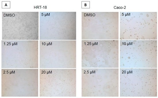 Figure 1. Sorafenib treatment for 72 h led to a dose-dependent decrease of viable cells in both cell lines. (A) The KRAS-mutated HRT-18 cell line and (B) The KRAS wild-type Caco-2 cell line (400× magnification).