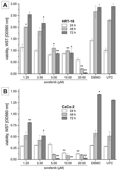 Figure 2. Dose- and time-dependent viability of (A) HRT-18 cells and (B) Caco-2 cells. Cells were seeded in 96-well microplates and treated with 1.25, 2.50, 5.00, 10.00 and 20.00 µM sorafenib. Viability was analyzed using WST-1 assay after 24, 48 and 72 h sorafenib treatment; data points represent mean values ± SEM of two independent experiments. ‘DMSO’ indicates samples treated with the solvent only (highest concentration). *, ** indicate values significantly (p < 0.05) or highly significantly (p < 0.01) different from the untreated control (UTC), respectively (two-sided, unpaired t-test).