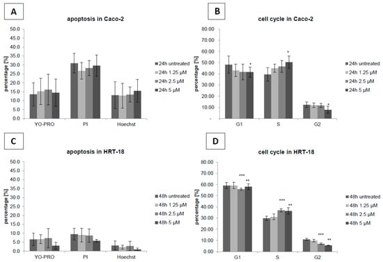 Figure 3. (A,C) No differences in staining patterns of YO-PRO, Hoechst and propidium iodide (PI) were observed after 24 h of sorafenib treatment in Caco-2 and after 48 h in HRT-18 cells and (B,D) A shift towards the S-phase in cell cycle was observed with increasing concentrations of sorafenib for both cell lines. *, **, *** indicate values significantly (p < 0.05), highly significantly (p < 0.01) or (p < 0.001) different from the solvent control, respectively (two-sided, unpaired t-test); untreated DMSO control indicates untreated cell samples.