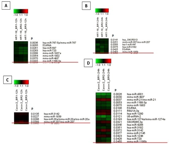 Figure 4. Microarray analysis identified several significantly differentially expressed miRNAs in the cell lines HRT-18 (A,B) and Caco-2 (C,D) upon sorafenib treatment compared to untreated controls (p < 0.05, red line indicated the border for significantly differential expressed miRNAs). Non-coding small RNAs were ranked based on differential expression. (A) HRT-18 cell expression analysis after 12 h (n = 3); (B) HRT-18 cell expression analysis after 24 h (n = 3); (C) Caco-2 cell expression analysis after 12 h (n = 3); and (D) Caco-2 cell expression analysis after 24 h (n = 3).
