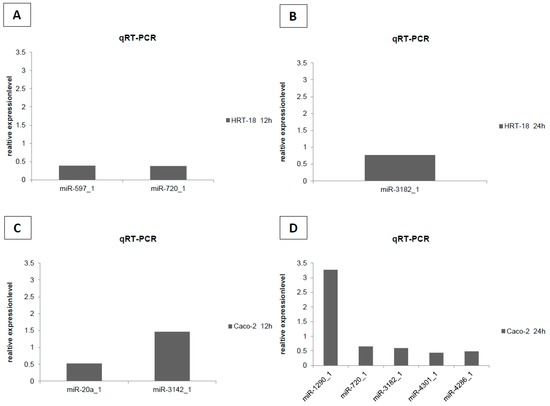 Figure 5. Quantitative RT-PCR (RT-qPCR) confirmation study of nine miRNAs. Except miR-767-3p, which was not detectable by RT-qPCR, we could confirm all other miRNAs detected by the microarray (miR-597, miR-720, miR-3182, miR-20a, miR-4301, miR-3142, miR-4286, miR-3142, miR-4286 and miR-1290). miRNA expressions normalized to SNORD68 are shown in relation to the untreated DMSO control. Representative examples of technical replicates are shown. (A) HRT-18 cell expression analysis after 12 h; (B) HRT-18 cell expression analysis after 24 h; (C) Caco-2 cell expression analysis after 12 h; and (D) Caco-2 cell expression analysis after 24 h.
