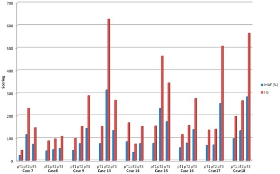 We focus on mutational intra-tumoral heterogeneity, defined as subclones with different mutant allele frequencies. Therefore, we calculated mutant allele frequency in neoplastic cells (MAFnc) and heterogeneity score (HS) for cases 7–9 and 13–18, which harbored the same mutation from the submucosa (pT1), the muscular layer (pT2) to the subserosa (pT3) (Figure 1). MAFnc is the mutant allele frequency normalized to 100% tumoral cells and HS corresponds to the fraction of neoplastic cells carrying a specific mutation and was calculated assuming that somatic mutations are usually heterozygous events [20]. Mean HS increased with T stage, 128.4 ± 46.1 standard deviation (SD) in pT1, 234.1 ± 186.8 SD in pT2 and 296.2 ± 156.9 SD in pT3 (p = 0.03) (Figure S2). We observed that HS was higher in pT3 areas in 55% of cases (n = 5/9) regardless of the mutation. Mean total HS (sum of HS for each mutation in one tumor) was 692.6 ± 262.6 SD. Total HS score was associated neither with tumor stage (p = 0.78), nor with tumor location (p = 0.90), nor with tumor recurrence (p = 0.56).