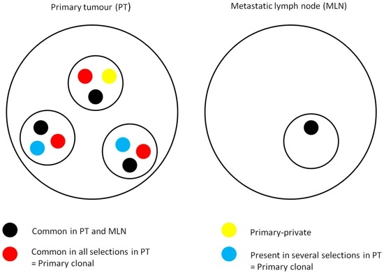 Concordance of KRAS and BRAF status between primary and metastatic lesions in mCRC has been considered to be over 95% [17,18,19]. To our knowledge, few studies have evaluated inter-tumoral heterogeneity of RAS mutations between primary tumors and lymph nodes or distant metastatic lesions. We observed 36% of inter-tumoral heterogeneity, with RAS mutated primary tumors being WT in lymph nodes and/or distant metastatic lesions. In addition, metastatic lymph nodes may have different RAS mutations as compared to primary tumors. Concerning metastatic lymph nodes, only limited data concerning KRAS mutations are available. In one study, heterogeneity in KRAS mutations between primary tumors and lymph node metastases was found in approximately 30% of cases [27]. To summarize, in some tumors, KRAS or NRAS mutations were “universal” as they were present in all macrodissected areas in primary lesions and in metastases. In other cases, we observed multiple subclones with mutations present only in one area or present in all areas in primary lesions but not in metastases, and they could be classified as “primary-private” and as “primary-clonal”, respectively, as described by others [26] (Figure 2).