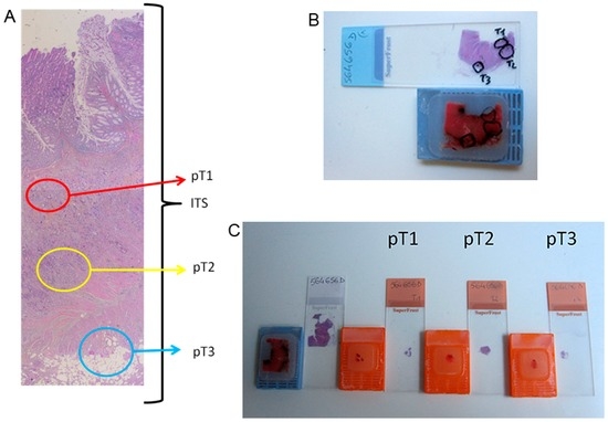 Tumoral selection and macrodissection. (A) Tumoral selections on the HES slide: tumoral selections on the HES slide were performed according to pathological tumor node metastasis staging (pTNM) 2009 in submucosa (pT1), in the muscular layer (pT2) for pT2 tumors, selection in submucosa, in the muscular layer and in subserosa (pT3) for pT3 and pT4 tumors; (B) tumoral selections on the HES slide and paraffin block: tumoral zones selected on the HES slide were transposed on the corresponding paraffin block; and (C) paraffin blocks and HES slides of macrodissected tumoral selections: the corresponding area of each tumoral selection was macrodissected and included in a new paraffin block. An additional HES staining was performed to ensure correspondence with the originally selected area. ITS: initial transparietal section; HES: haematoxylin-erythrosin-saffron.