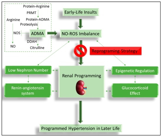 This review aims to summarize evidence linking ADMA-related NO-ROS imbalance to the development of hypertension with a focus on the kidney and to provide various manipulations of the ADMA-NO pathway prior to hypertension in favor of NO as a reprogramming approach to prevent programmed hypertension.