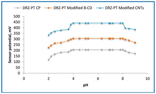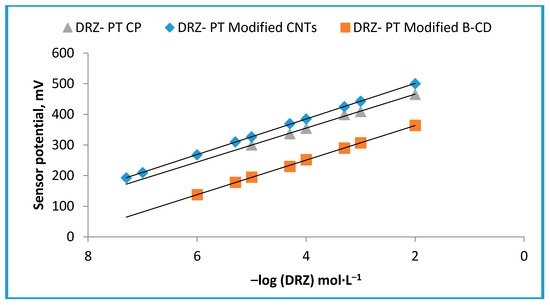 The linear relationship of the fabricated DRZ−PT carbon paste, modified β-CD, and CNT sensors were investigated using the drug concentration range of 1.0 × 10−8–1.0 × 10−1 mol·L−1. The linear concentration ranges of 1.0 × 10−5–1.0 × 10−2, 1.0 × 10−6–1.0 × 10−2, and 5.0 × 10−8–1.0 × 10−2 mol·L−1 for the sensors I, II, and III, respectively were recorded. An increase in sensitivity of the modified CP sensor using 2-hydroxypropyl-β-CD than the conventional carbon paste sensor was observed. While, due to the porous large surface area and the best sensor electrolyte interface of the modified CNT sensor, we can notice the higher performance characteristics of sensor III than sensors I and II. The evaluated lower detection limits were found to be 5.0 × 10−6, 5.0 × 10−7, and 1.9 × 10−8 mol·L−1 for sensors I, II, and III, respectively.