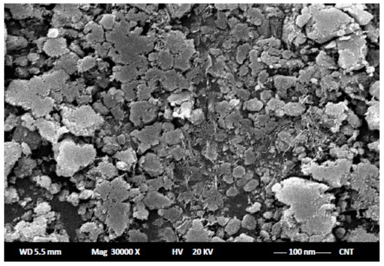 To prepare the modified carbon nanotubes sensor, a small amount, about 3%, of multi-wall carbon nanotube particles was added to 57% of pure graphite powder (1–2 μm), 10.0% DRZ-PT as the electroactive material, and 30.0% o-NPOE as a liquid plasticizer. The paste was homogeneously mixed, then the procedure, as previously mentioned, was applied. As seen in Figure 5, the surface of the carbon paste sensors were investigated under a scanning electron microscope (SEM).