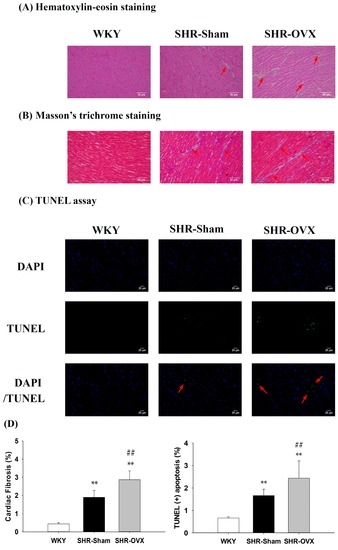Representative histopathological analyses of cardiac sections from the left ventricles in the Wistar Kyoto rats (WKY), SHR with sham-operated (SHR-Sham) and SHR with bilateral ovariectomized (SHR-OVX) groups were performed with (A) hematoxylin-eosin staining (interstitial space: wide, arrows indicated) and (B) Masson’s trichrome staining (fibrosis: blue color, arrows indicated). The images of the myocardial architecture are magnified 200×; (C) Representative stained apoptotic cells of cardiac sections were performed by staining with 4,6-diamidino-2-phenylindole (DAPI) staining (top, blue spots) and the terminal deoxynucleotidyl transferase dUTP-mediated nick-end labeling (TUNEL) assay (bottom, green spots, arrows indicated) The images of myocardial architecture are magnified 400×; (D) The bar represents the percentage of the blue area to the field area in Masson’s trichrome staining, and the percentage of TUNEL apoptosis was expressed as the ratio of TUNEL-positive cells relative to total DAPI-stained nuclei and indicates mean values ± SD (n = 6 in each group); ** p < 0.01 denotes significant differences from the WKY group; ## p < 0.01 denotes the significant differences between the SHR-Sham group and the SHR-OVX group.