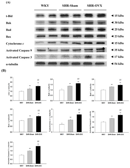 (A) The two representative protein products of t-Bid, Bak, Bad, Bax, cytochrome c, activated caspases 9 and activated caspases 3 extracted from the left ventricles of the excised hearts from the Wistar Kyoto rats (WKY), SHR with sham-operated (SHR-Sham) and SHR with bilateral ovariectomized (SHR-OVX) were measured by Western blot analysis; (B) The bars represent the relative protein quantification of t-Bid, Bak, Bad, Bax, cytochrome c, activated caspases 9 and activated caspases 3 on the basis of α-tubulin and the average protein expression levels in the WKY group normalized to one, and then, a relative protein expression was calculated for each condition. Data presented as the mean values ± SD (n = 8 in each group); ** p < 0.01 denotes significant differences from the WKY group; ## p < 0.01 denotes significant differences between the SHR-Sham group and the SHR-OVX group.