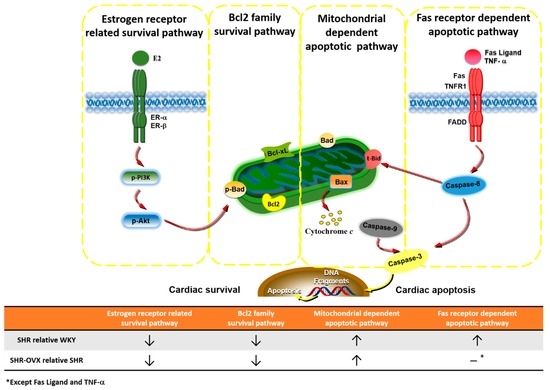 Apoptosis is triggered by the two major pathways of the intrinsic mitochondria-dependent and extrinsic Fas receptor-dependent apoptotic pathways [10,11]. The mitochondria are the main sites of action for members of the apoptosis-regulating protein truncates Bid (t-Bid), which translocate to induce the oligomerization of Bcl-2 antagonist or killer (Bak), Bcl-2-associated death promotor (Bad) and Bcl-2-associated X protein (Bax). These pro-apoptotic proteins can enhance cytochrome c release from the mitochondria into the cytosol, which is responsible for activating caspases -9 and -3, expediting the apoptotic progression [10,12,13]. Fas ligand or TNF-α binding with its death receptors on the cell membrane and the formation of a death-inducing signaling complex through recruitment of Fas-associated death domain (FADD), resulting in caspase 8 activation, leads to caspase-3 cleavage, which executes the cell death program [10]. Several studies have shown that deficiency of estrogen promotes cardiac apoptosis-related death, which may worsen cardiac dysfunction and heart failure [14,15,16]. Moreover, cardiomyocyte apoptosis is a very critical early pathological feature of chronic disease and the development of heart failure [17,18,19,20]. Cardiomyocyte apoptosis is increased in cardiac diseases or heart failure and is regarded as a marker of poor cardiovascular outcomes [17,21]. However, the mechanism of cardiac apoptosis in the coexistence of hypertension and ovariectomy is not understood.