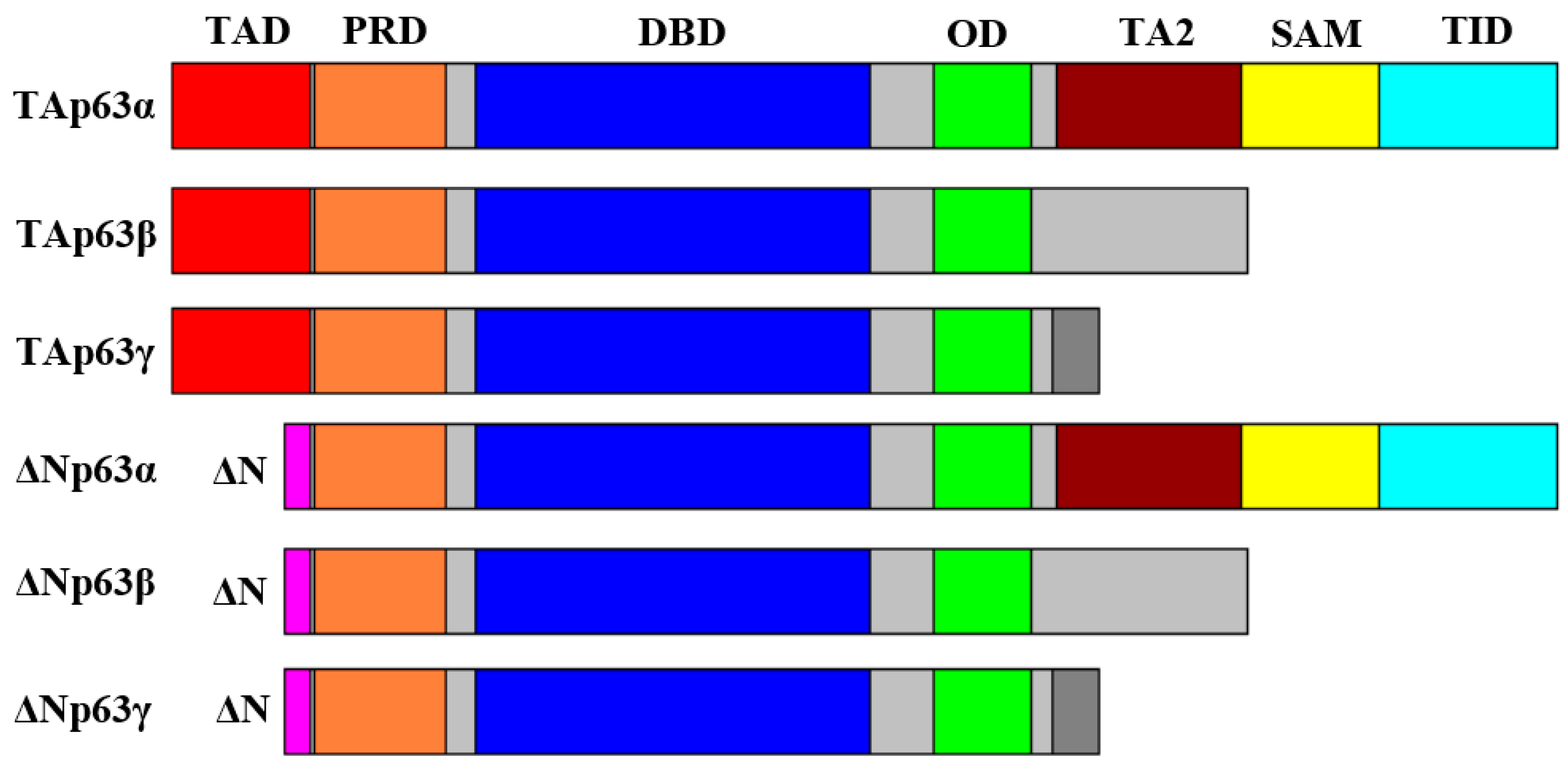 Six isoforms of p63 including all domains of each transcript including the transactivation domain (TAD), the proline-rich domain (PRD), the DNA-binding domain (DBD), the oligomerization domain (OD), the second transactivation domain (TA2), the sterile α motif domain (SAM), and the transactivation-inhibition domain (TID).