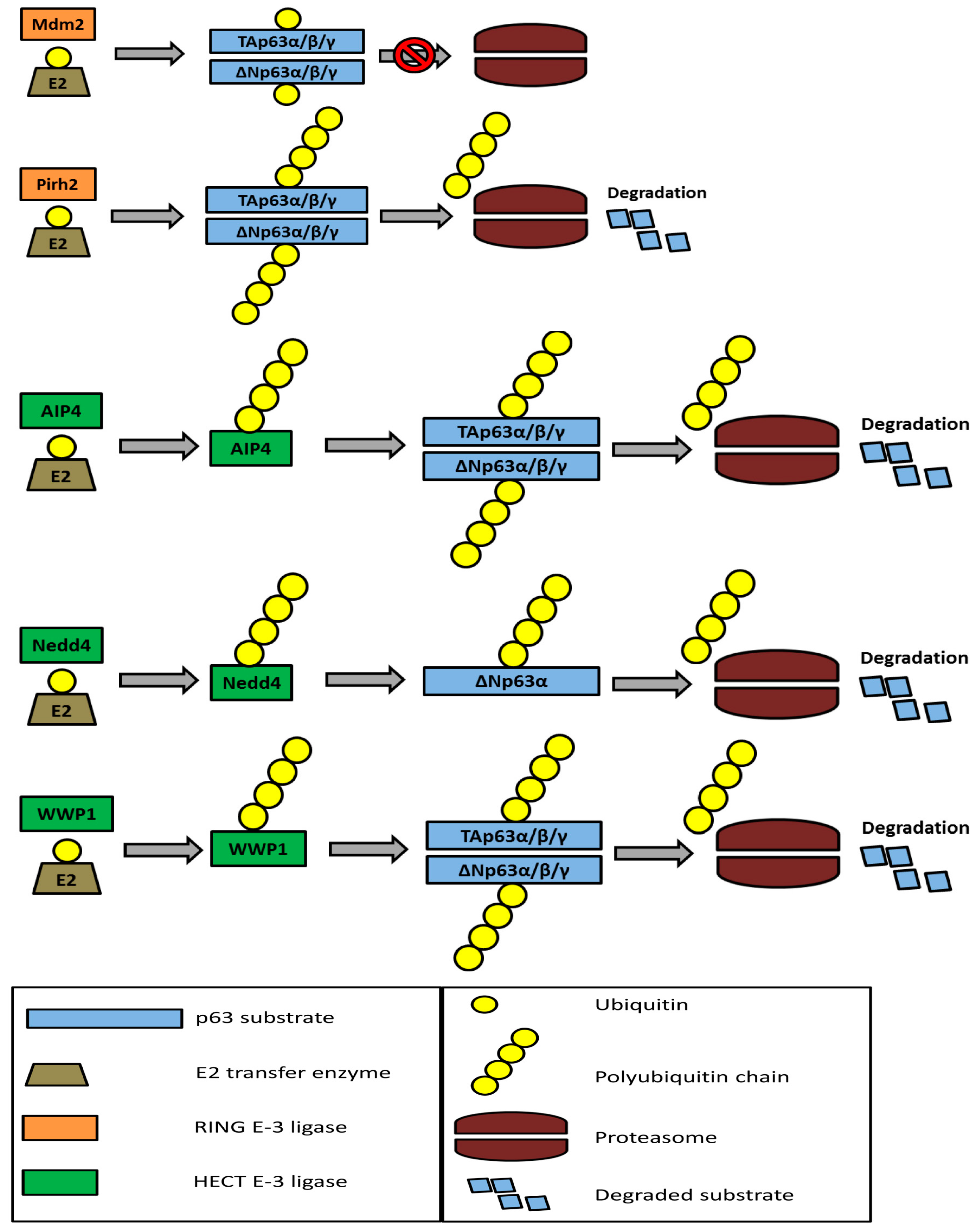 Overview of the regulation of p63 isoforms. This figure outlines the different ubiquitin E3-ligases regulate p63 isoforms and how they interact with the p63 isoforms and subsequent proteasome degradation.