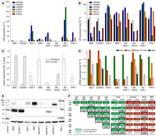 Relative expression of miR200 family members, miR205 and EMT-related markers (mRNA, protein) in BTC cell lines. (A,B) expression levels of miRs related to RNU6B using a linear (A) and a logarithmic (B) scale, respectively; (C) quantitative protein expression (densitometry) of epithelial marker E-cadherin and mesenchymal marker vimentin; (D) mRNA levels of EMT markers related to β-actin; (E) representative Western blot images (cropped); (F) Spearman correlation analysis of miR expression with miR expression as well as mRNA/protein expression of EMT markers (E-cadherin, vimentin, N-cadherin, ZEB1). The first numeric value in each analysis (rectangle) represents the correlation-coefficient (green for positive correlation, red for negative correlation), the second represents the p-value (highlighted grey when significant). Rectangles of significant correlations are highlighted by a black border. Abbreviations: BTC: biliary tract cancer; Ecad: E-cadherin; EMT: epithelial to mesenchymal transition; miR: MicroRNA; Vim: Vimentin.