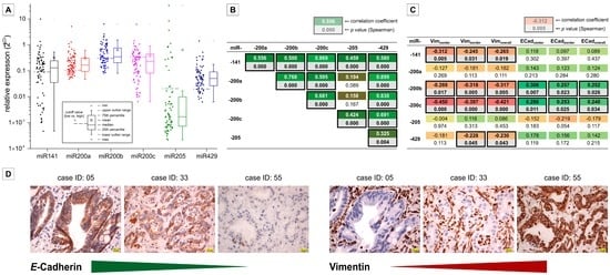 As summarized in Figure 2A, the five analyzed miR200 members as well as miR205 were detectable in all clinical BTC samples. MicroRNA-141 and miR205 were more heterogeneously expressed compared to the remaining miRs, which showed a smaller range of expression. It is worth noting that miR205 generally showed the lowest expression in the analyzed patient samples. Similar to the results obtained from the in vitro cell line experiments, the expression of each miR200 family member significantly positively correlates with the expression of each other tested miR (Figure 2B). In addition, we measured expression levels of E-cadherin and vimentin in all clinical BTC samples via semi-quantitative immunohistochemistry. Figure 2D illustrates examples of cases with low, medium and high expression, respectively, for each of the two proteins. Correlation analysis proves a highly significant inverse correlation between vimentin and E-cadherin (Spearman′s correlation coefficient = −0.729, p < 0.001). In accordance with the data obtained by the in vitro experiments, the expression of these proteins is nearly mutually exclusive, i.e., high E-cadherin is associated with low vimentin expression and vice versa. Comparing those data to the case-specific expression levels of miR200 family members, a positive correlation of miR expression with expression of E-cadherin, and a negative correlation with expression of vimentin (Figure 2C) was observed. Of note, these calculations were highly significant for miR200b and miR200c. In contrast, miR205 expression—by trend—negatively correlated with E-cadherin and (for border and overall expression) correlated positively with vimentin expression.