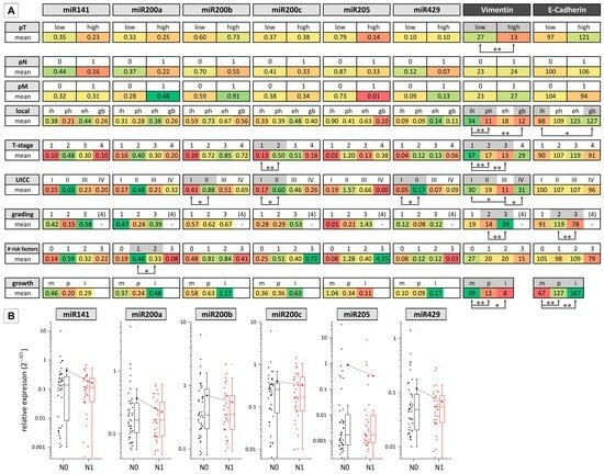 Association of miR200 family/miR205 expression with clinicopathological parameters for n = 78 biliary tract cancer cases. (A) For each variable (miRs (qRT-PCR), vimentin, E-cadherin (semi-quantitative immunohistochemistry)), the mean expression value is shown and highlighted by color (ranging from green = high expression to red = low expression). Differences between grading could be analyzed only for G1–G3 as the cohort included only one case of G4. Significant differences between the two group or more groups (calculated using a Student′s t-test and ANOVA/LSD (least significant difference) post hoc test, respectively) are highlighted by grey shading and arrows (* p < 0.05 and ** p < 0.01, respectively); (B) microRNA expression pattern exemplified for N0 and N1 groups of patient samples. Abbreviations: eh, extrahepatic; gb, gall bladder; i, intraductal; ih, intrahepatic; m, mass-forming; p, periductal; ph, perihilar.
