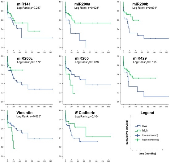 Survival analysis of biliary tract cancer (n = 78) cases with regard to expression levels of miR200 family members, miR205, E-cadherin and vimentin. The cut-off value for distinguishing cases with low or high expression of the respective miRNA or protein was determined by the receiver operating characteristic (ROC) calculation and Youden Index analysis.