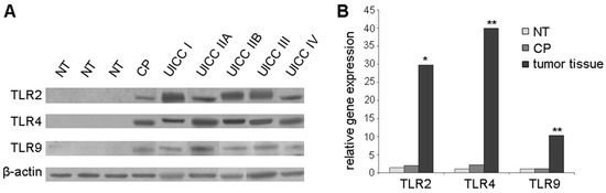 Western blot analysis of pancreatic tissue showed no protein expression of TLR2, -4, and -9 in normal pancreatic tissue (NT) compared to increased expression in tissue of chronic pancreatitis (CP) and in particular in primary pancreatic cancer at all stages (UICC I, IIA, IIB, III, and IV) (Figure 1A).