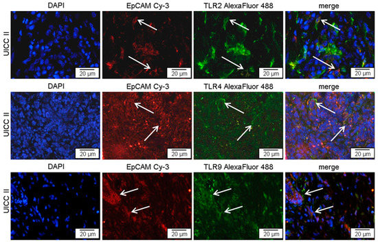 TLR2, -4, or -9 expressing tumor cells in pancreatic cancer tissue. Representative examples of immunofluorescence double staining, showing TLR (green) and EpCAM (red) co-staining (arrows) in tumor cells of patients with pancreatic cancer UICC II. AlexaFluor 488, green; Cy3 (indocarbocyanin), red; DAPI (49,6-diamidino-2-phenylindoldihydrochlorid), blue—nuclear counterstaining.