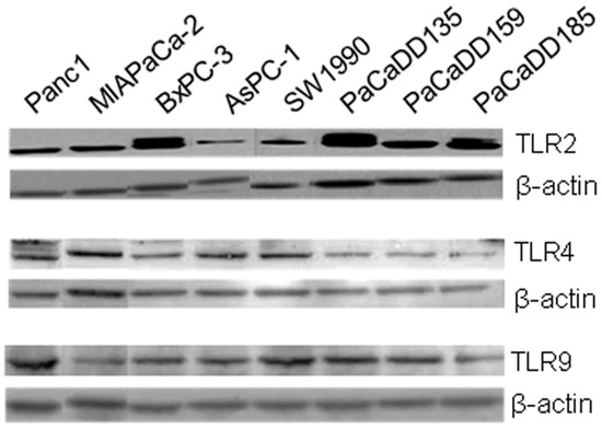 Western blot analysis of TLR2, -4, and -9 expression in human pancreatic cancer cell lines. TLR2, -4, and -9 protein expression was detected in all investigated established pancreatic cancer cell lines (Panc1, MIAPaCa-2, BxPC-3, AsPC-1, and SW1990) and primary pancreatic cancer cell lines (PaCaDD135, PaCaDD139, and PaCaDD185). β-actin probe was used as a control for protein loading.