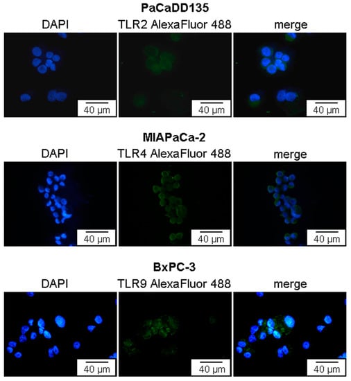 Immunofluorescent staining of TLR2, -4, and -9 in PaCaDD135, MIAPaCa-2, and BxPC-3 pancreatic cancer cells. Representative examples showing TLR2, -4, and -9 expression (green). Cell surface localization of TLR2 and -4 as well as intracellular localization of TLR9 can be identified. AlexaFluor 488, green; DAPI (49,6-diamidino-2-phenylindoldihydrochlorid), blue—nuclear counterstaining.