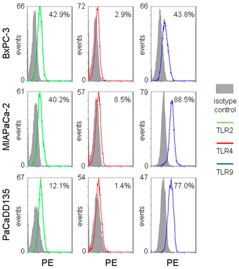 2.2. TLR2, -4, and -9 Are Expressed in Human Pancreatic Cancer Cell Lines