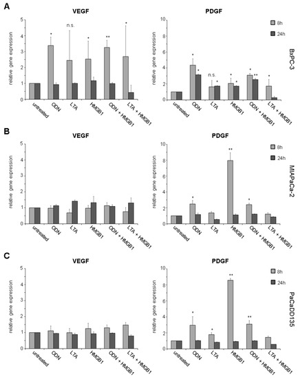 Gene expression analysis of VEGF and PDGF in pancreatic cancer cell lines after treatment with TLR ligands: BxPC-3 (A); MIAPaCa-2 (B); and PaCaDD135 (C) were incubated with ODN, LTA, HMGB1, ODN + HMGB1, and LTA + HMGB1 and analyzed by RT-qPCR 8 and 24 h after stimulation. Increased VEGF gene expression was observed only in BxPC-3 cells, whereas PDGF was significantly expressed in all three cancer cell lines. Untreated cells were standardized to baseline. The relative gene expression is expressed as 2−ΔΔCq. * p < 0.05, ** p < 0.005, n.s. not significant.