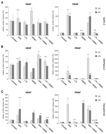 Luminex analysis of VEGF and PDGF expression in supernatants of human pancreatic cancer cells after treatment with TLR ligands: BxPC-3 (A); MIAPaCa-2 (B); and PaCaDD135 (C) were incubated with ODN, LTA, HMGB1, ODN + HMGB1, and LTA + HMGB1 and supernatants were analyzed 24 h and 48 h after stimulation. Untreated cells were standardized to baseline. * p < 0.05, ** p < 0.005, *** p < 0.0001, n.s. not significant.
