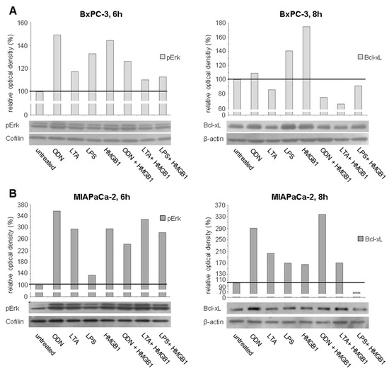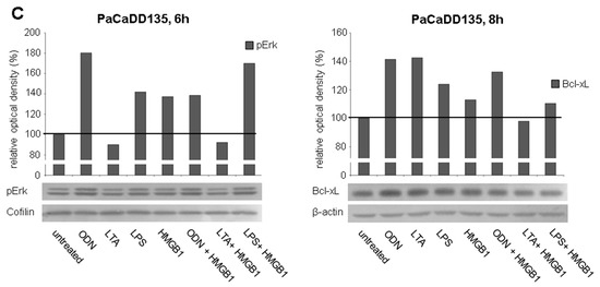 Phosphorylation of the MAPK pathway component Erk was analyzed after TLR activation by Western blot. In BxPC-3 cancer cells single treatment with TLR agonists either alone or in combination resulted in increased phosphorylation of Erk (ODN: relative optical density, ROD = 149%, LTA: 118%, LPS: 133%, HMGB1: 144%, ODN + HMGB1: 126%, LTA + HMGB1: 110%, and LPS + HMGB1: 113%) (Figure 8A, left). MIAPaCa-2 cells treated with the TLR ligands demonstrated comparably more pronounced pErk activation then BxPC-3 cancer cells (ODN: ROD = 357%, LTA: 295%, LPS: 135%, HMGB1: 296%, ODN + HMGB1: 242%, LTA + HMGB1: 329%, and LPS + HMGB1: 282%). (Figure 8B, left). In PaCaDD135 tumor cells, increased phosphorylation of Erk was observed after treatment with almost all TLR ligands (ODN: 180%, LPS: 142%, HMGB1: 137%, ODN + HMGB1: 139%, and LPS + HMGB1: 170%) (Figure 8C, left). Next to pErk, expression of the anti-apoptotic Bcl-xL protein was examined. In BxPC-3 tumor cells treatment with two of the used TLR ligands as well as LPS resulted in increased Bcl-xL expression (ODN: ROD = 109%, LPS: 140%, and HMGB1: 175%) (Figure 8A, right). In MIAPaCa-2 cells, Bcl-xL expression was more intensified compared to BxPC-3 cells, and this after treatment with all TLR ligands (ODN: ROD = 291%, LTA: 204%, LPS: 170%, HMGB1: 164%, ODN + HMGB1: 339%, and LTA + HMGB1: 170%) (Figure 8B, right). PaCaDD135 cells expressed increased Bcl-xL in a range between the other two analyzed cancer cell lines (ODN ROD = 141%, LTA: 142%, LPS: 124%, HMGB1: 113%, ODN + HMGB1: 133%, and LPS + HMGB1: 110%) (Figure 8C, right).