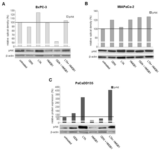 Phosphorylation of the PI3K/Akt/mTOR pathway component Akt was analyzed after TLR activation by Western blot. Treatment of BxPC-3 cancer cells with LTA alone or in combination with HMGB1 resulted in an increased phosphorylation of Akt (LTA: ROD = 124%; LTA + HMGB1: ROD = 105%) (Figure 9A). MIAPaCa-2 cells demonstrated likewise elevated pAkt levels after activation with the TLR ligands either alone or when given together (ODN: ROD = 120%; LTA: ROD = 104%; HMGB1: ROD = 120%; ODN + HMGB1: ROD = 126% and LTA + HMGB1: ROD = 127%) (Figure 9B). In PaCaDD135 TLR activation resulted in much higher pAkt levels (ODN: ROD = 148%; LTA: ROD = 346%; and LTA + HMGB1: ROD = 437%) (Figure 9C).