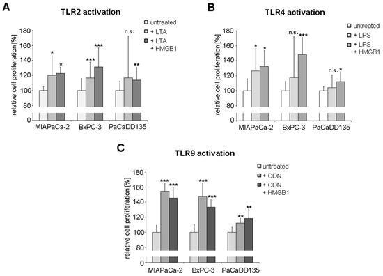 Treatment with the TLR4 ligands LPS and LPS + HMGB1 also caused significantly increased cancer cell proliferation compared to untreated cells (MIAPaCa-2: 127%, p < 0.05 and 132%, p < 0.05; BxPC-3: 118% and 148%, p < 0.0001; PaCaDD135: 104% and 112%, p < 0.05) (Figure 10B). Interestingly, activation of TLR9 with ODN and ODN + HMGB1 showed highly significant proliferation promoting effects in MIAPaCa-2 (155% and 145%, p < 0.0001), BxPC-3 (147% and 133%, p < 0.0001), and PaCaDD135 cancer cells (112% and 118%, p < 0.005) (Figure 10C).