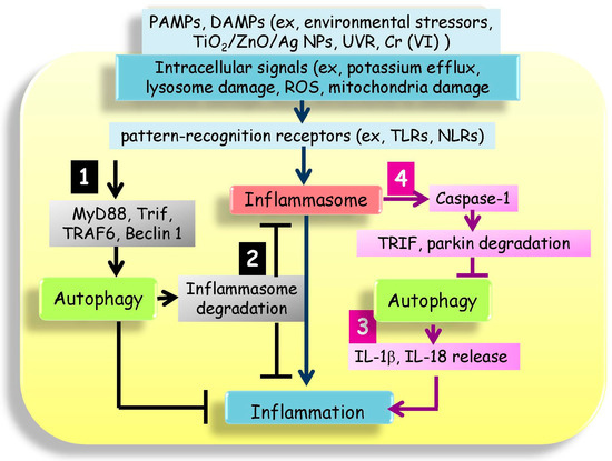 The induction of skin inflammation by environmental stressors such as ultraviolet radiation (UVR), hexavalent chromium (Cr(VI)), and TiO2/ZnO/Ag nanoparticles (NPs) has been demonstrated previously [8,9]. As a housekeeping pathway, cells utilize autophagy to maintain the homeostasis of an organ’s structure and function when exposed to environmental stressors [10]. However, only a few studies have examined the effect of autophagy and/or the inflammasome on the pathogenesis of skin diseases. In a recent review article, the authors highlighted the significance of autophagy regulation in skin diseases such as psoriasis, systemic lupus erythematosus, vitiligo, and infection [2]. They discussed the roles of autophagy in apoptosis, differentiation, inflammation and the immune response, thus highlighting the possible involvement of autophagy in skin disorders [2]. In our current review, we collect and integrate recent advances regarding autophagy and the inflammatory innate immune response, particularly the activation and regulation of the inflammasome. We posit that autophagy induction is a novel mechanism inter-modulating environmental stressor-induced skin inflammation. We also attempt to highlight the role of the inflammasome and the possible underlying mechanisms and pathways reflecting the pathogenesis of skin diseases induced by ultraviolet radiation (UVR), Cr(VI), and TiO2/ZnO/Ag NPs based on recent findings. A more profound understanding about the crosstalk between autophagy and the inflammasome will contribute to the development of prevention and intervention strategies against human skin disease.