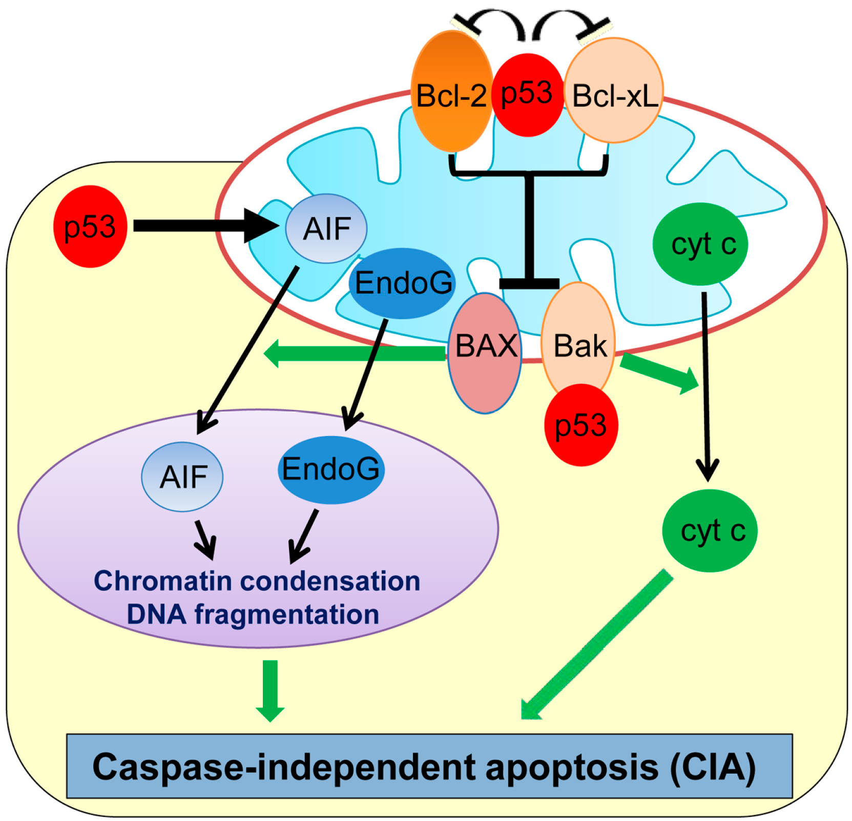 Schematic representation of caspase-independent apoptosis (CIA) and its regulation by p53. p53 transcriptionally upregulates AIF, binds and inhibits Bcl-2 and Bcl-xL, and also binds with Bak to induce CIA. AIF: Apoptosis-inducing factor; cyt c: cytochrome c; EndoG: endonuclease G.