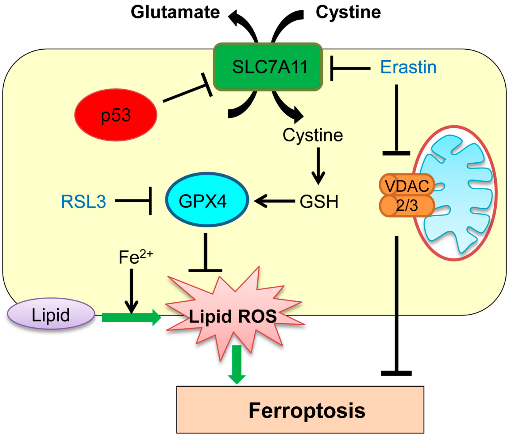 Role of p53 in ferroptosis. p53 transcriptionally represses solute carrier family 7 member 11 (SLC7A11), sensitizing cells to ferroptosis. GSH: glutathione; GPX4: glutathione peroxidase 4; ROS: reactive oxygen species; RSL3: Ras selective lethal 3; VDAC: voltage-dependent anion channels.