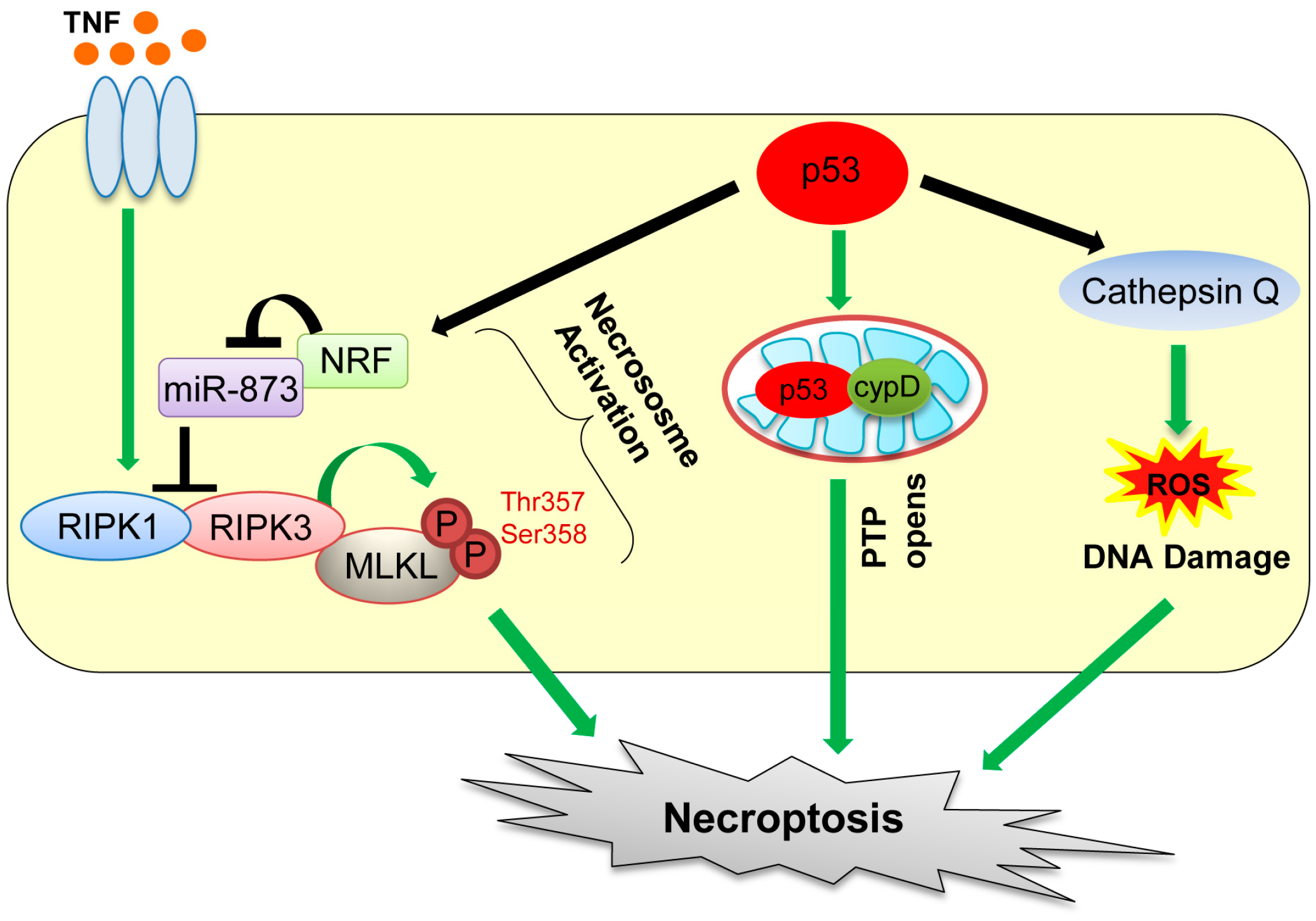 p53 also plays a role in oxidative stress-induced necroptosis. Tu et al. [73] show that etoposide can induce necroptosis in BAX/Bak double knockout MEFs. This is caused by cooperation of DNA damage-induced ROS with increase in cathepsin Q levels induced by p53 (Figure 3) [73]. Also, during oxidative stress, p53 is accumulated in the mitochondrial matrix, which enhances opening of mitochondrial permeability transition pore (PTP) via direct binding of p53 with a PTP regulator cyclophilin D (cypD), leading to mitochondrial swelling and induction of necroptosis (Figure 3) [74]. Recently, Wang et al. [75] showed that upon ischemia/reperfusion injury, p53 transcriptionally upregulates a long-noncoding RNA (lncRNA), named necrosis-related factor (NRF; Figure 3). Since necrosis-related factor (NRF) functions as an endogenous sponge RNA to repress microRNA-873 (miR-873) expression and miR-873 suppresses translation of RIPK1/RIPK3, NRF upregulation by p53 leads to decrease in miR-873 and increase in RIPK1/RIPK3 levels, leading to induction of necroptosis [75]. Thus, direct and indirect contributions of p53 to necroptosis have increasingly been recognized and likely have clinical implications in stroke pathology (transient ischemia–reperfusion injury of the brain) [74]. Indeed, inhibition of necroptosis by RIPK1 or mixed lineage kinase domain-like protein (MLKL) inhibitors is shown to be beneficial for ischemia–reperfusion injury in animal models [63]. However, this remains to be tested in human clinical trials.